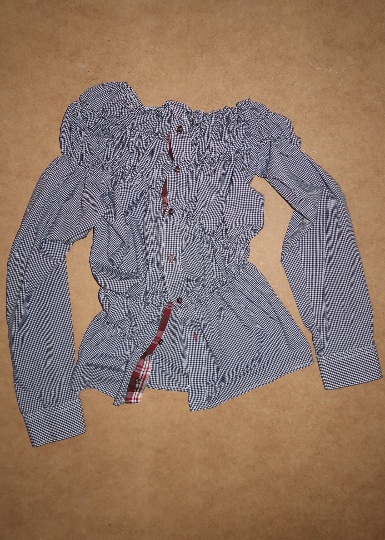 Every shirt is a one of a kind piece. They are carefully selected from vintage shops and upcycled in our copenhagen studio making every shirt special and unique. The elastic smock waist creates a bigger size spectrum ranging from small to large.